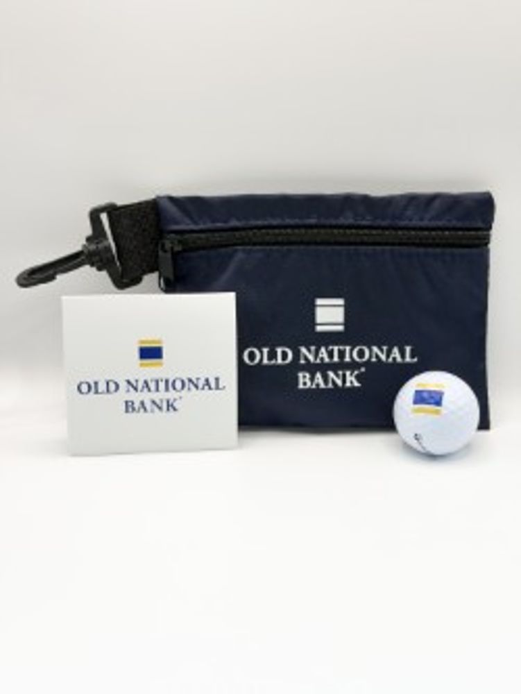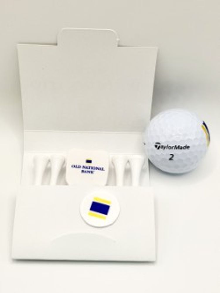 The Ditty Bag Golf Kit includes a TaylorMade Distance Plus golf ball, a matchbook tee holder with four blank white 2-3/4" wood tees, divot tool and a plastic ball marker. All packaged in a 7"x 5" nylon zipper pouch with clip.